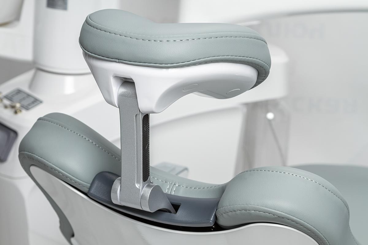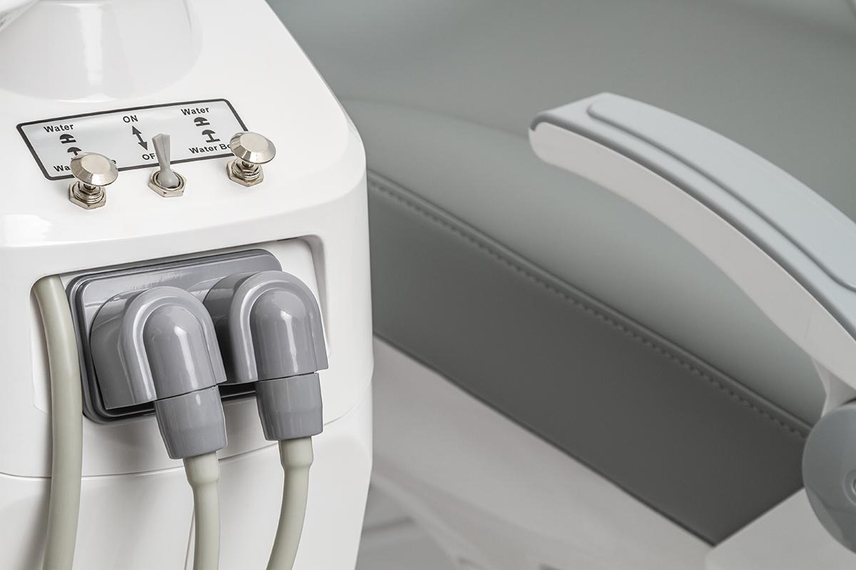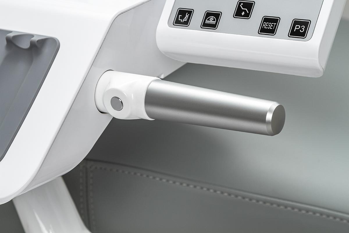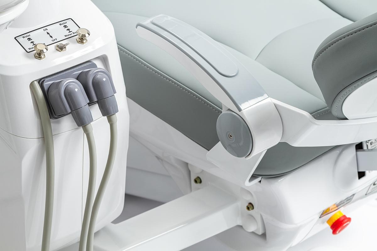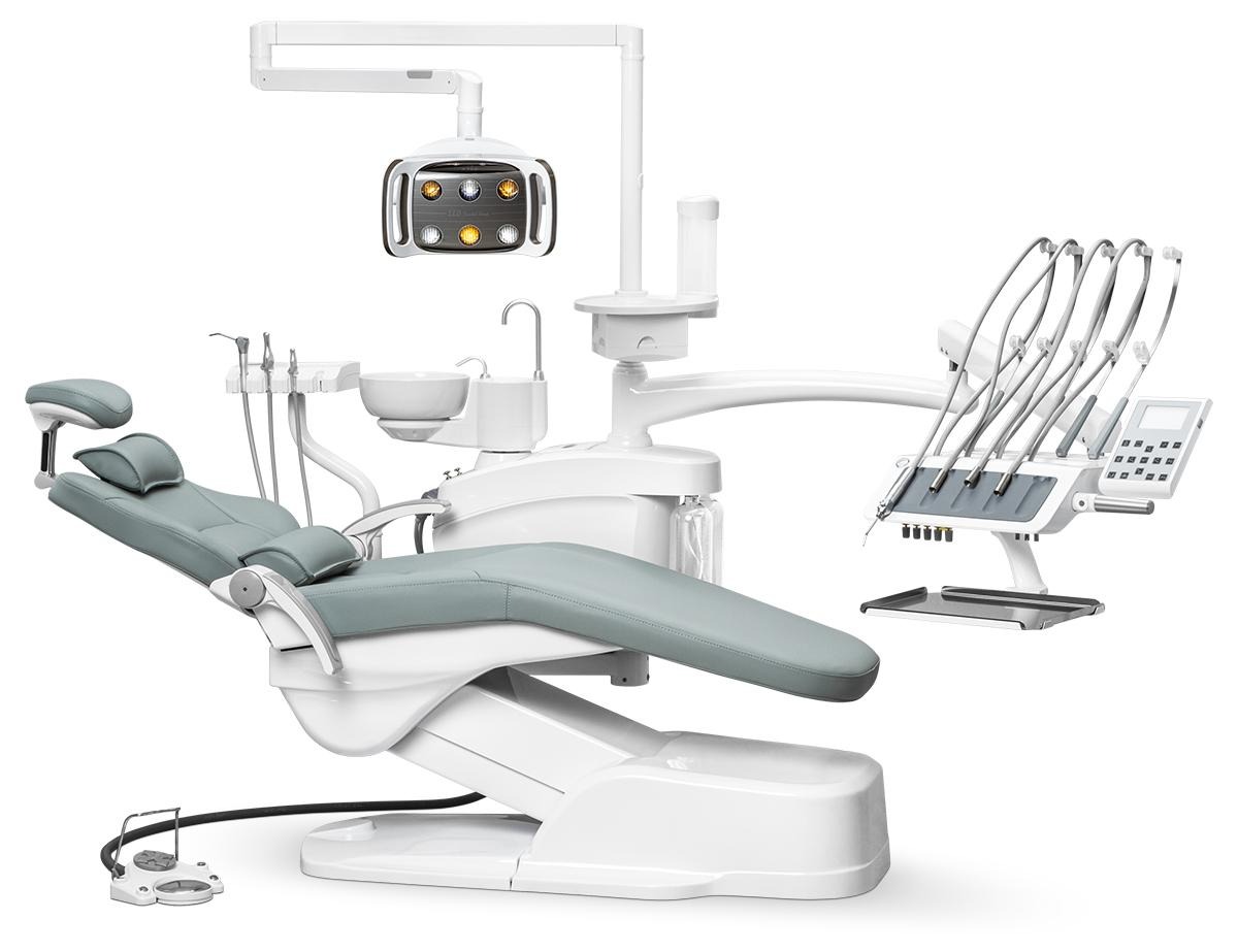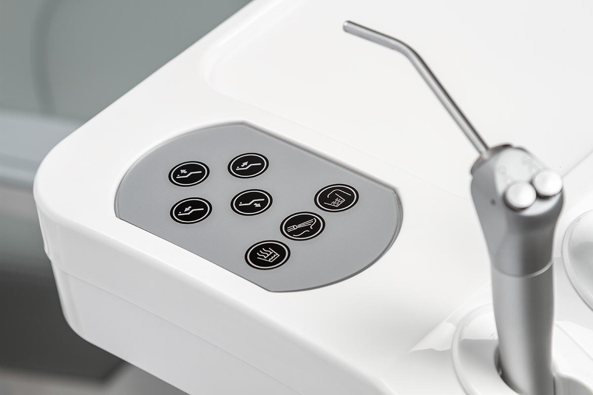 -Врачебный модуль имеет пантограф с пневмотормозом. Блок управления креслом и плевательницей. Четыре выхода М4 и водовоздушный спрей.