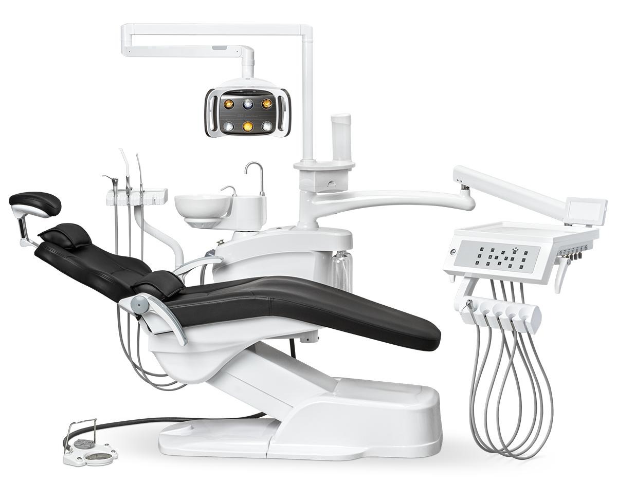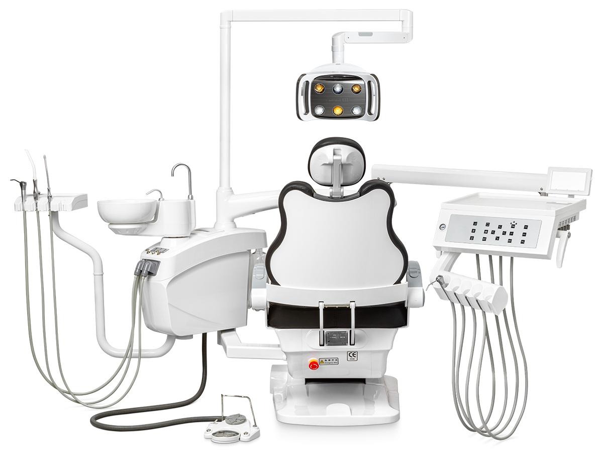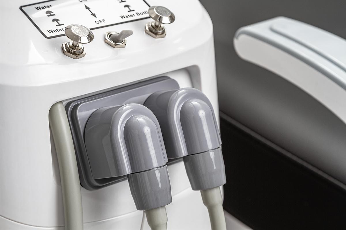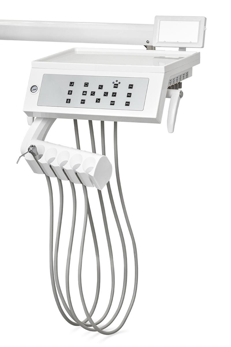 -Врачебный модуль имеет пантограф с пневмотормозом. Блок управления креслом и плевательницей. Четыре выхода М4 и водовоздушный спрей.