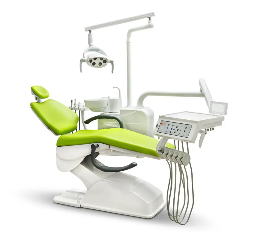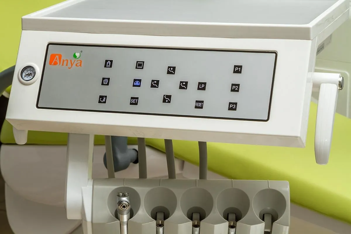 -Врачебный модуль имеет пантограф с пневмотормозом. Блок управления креслом и плевательницей. Четыре выхода М4 и водовоздушный спрей.