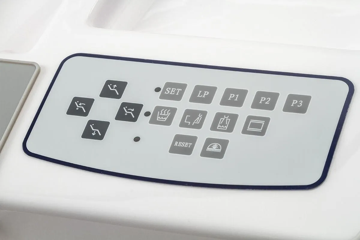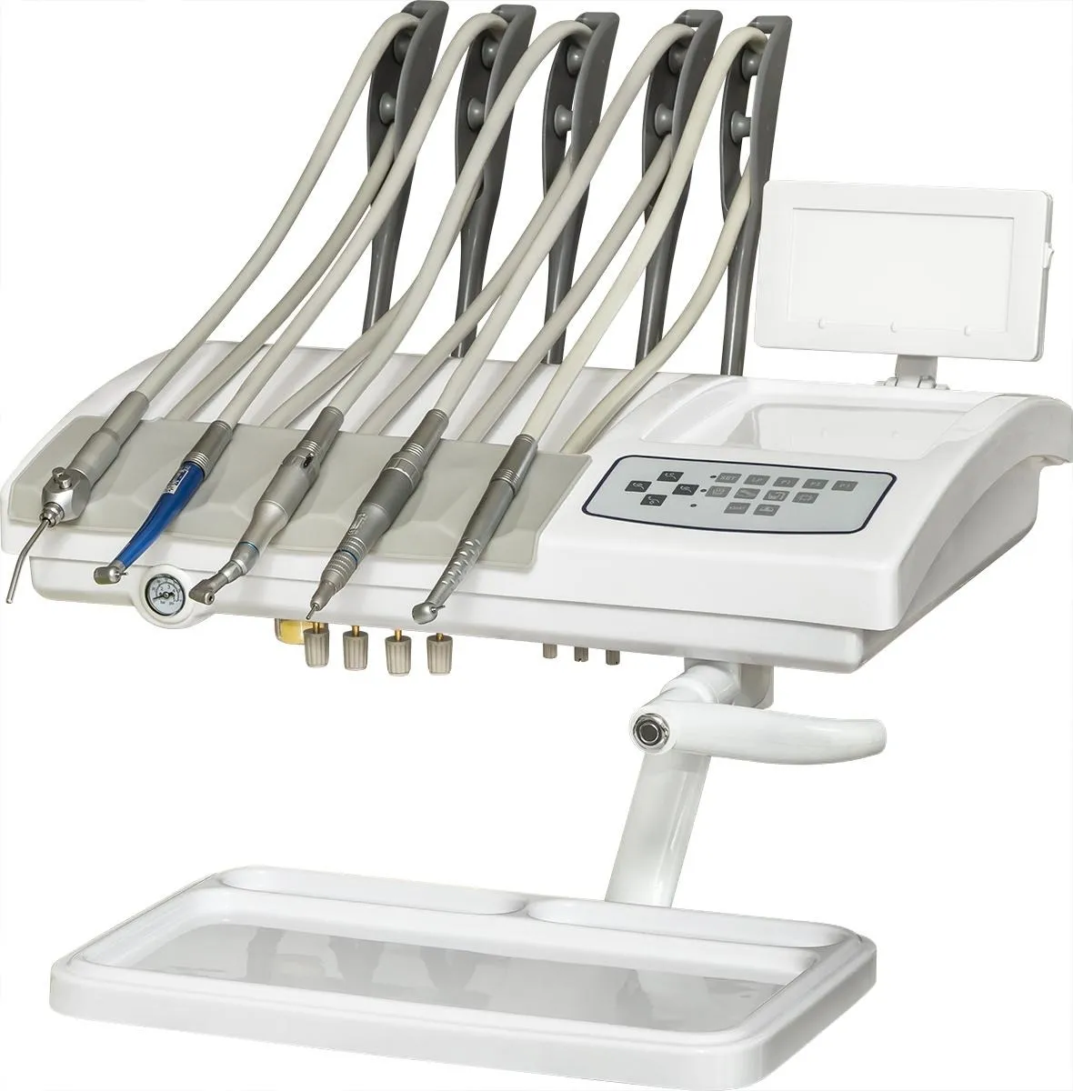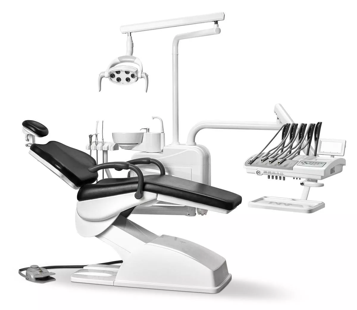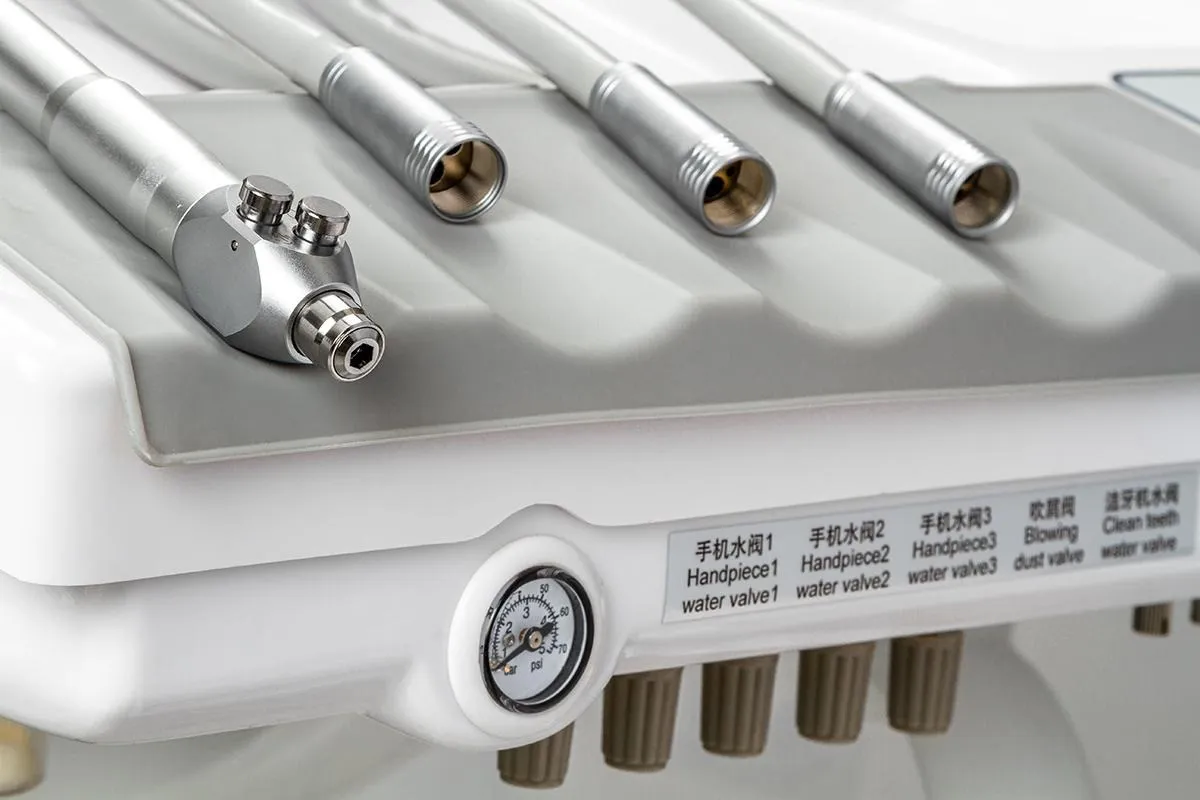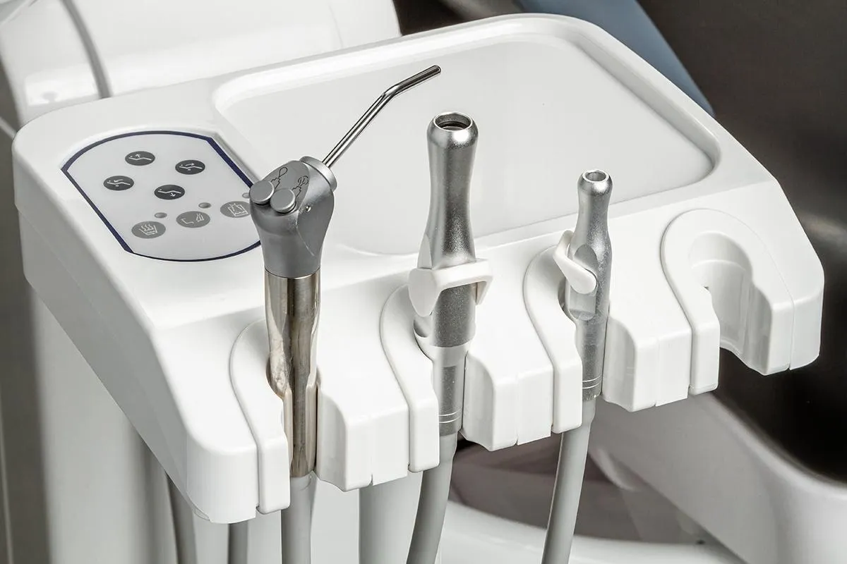 -Врачебный модуль имеет пантограф с пневмотормозом. -Сенсорный блок управления креслом и плевательницей. -Четыре выхода М4 и водовоздушный спрей.
