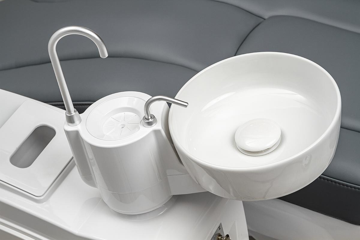 Плевательница разборная, автоклавируемая, керамическая, угол поворота 90 градусов, состоит из 3 частей, есть функции автоматического обмывания чаши и наполнения стакана.