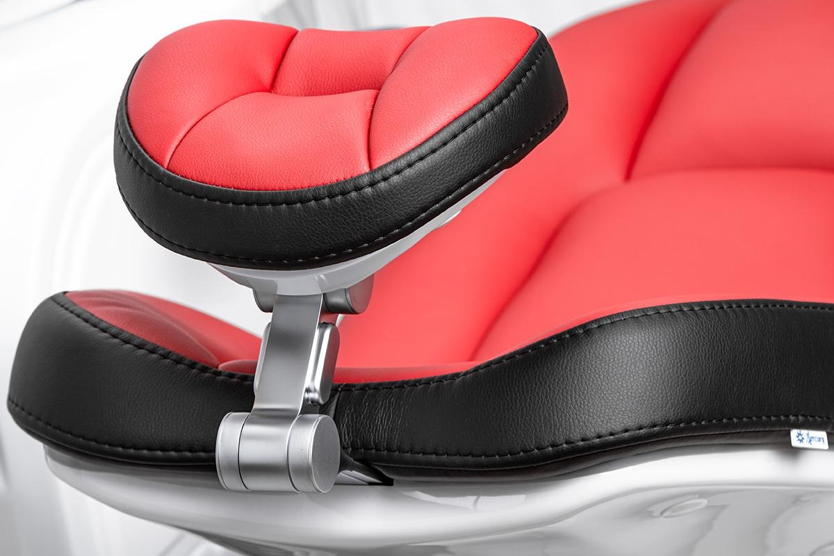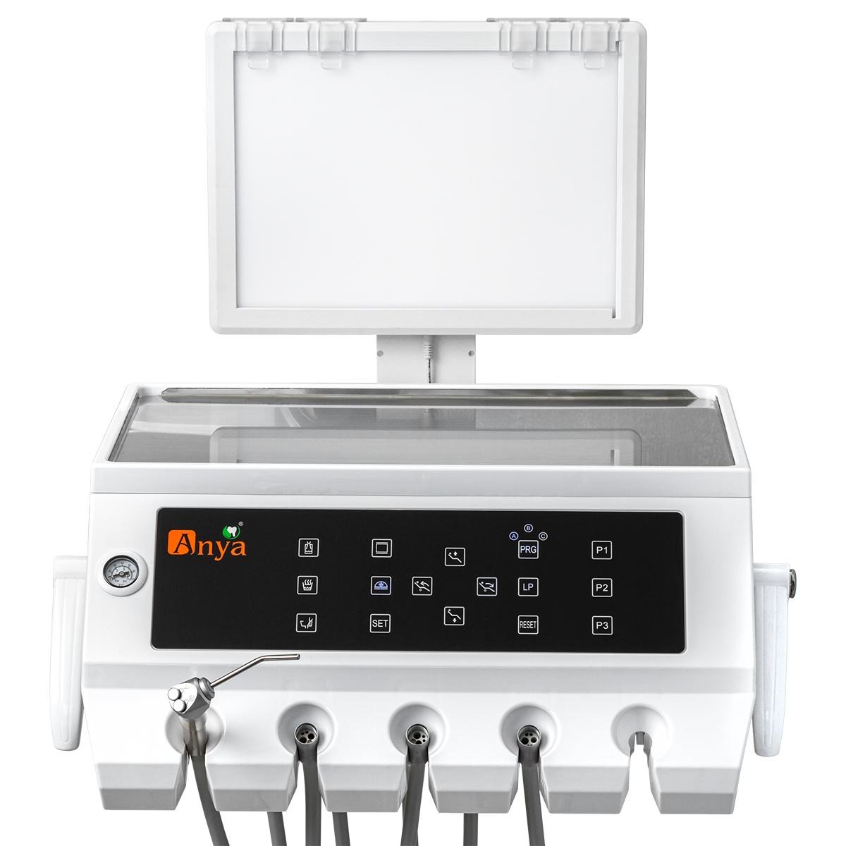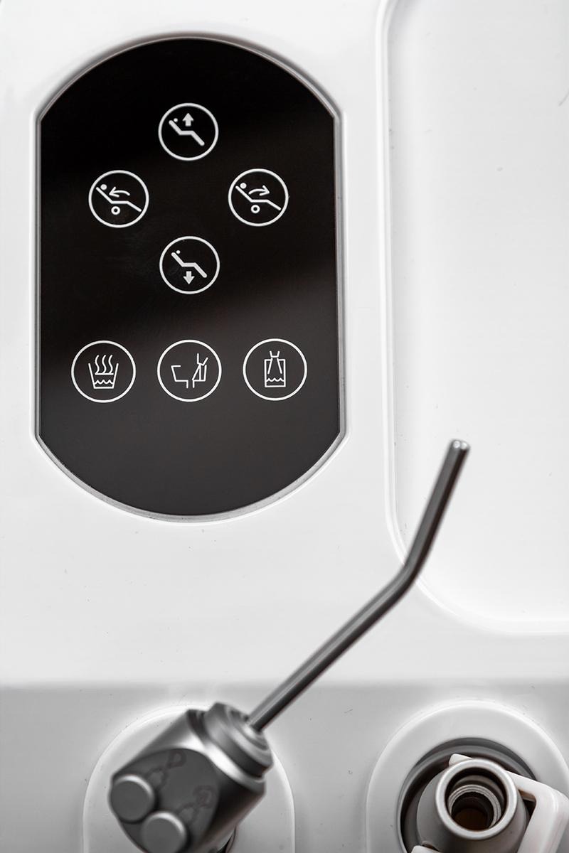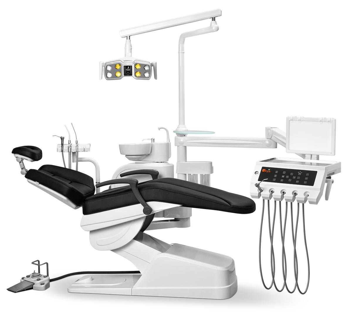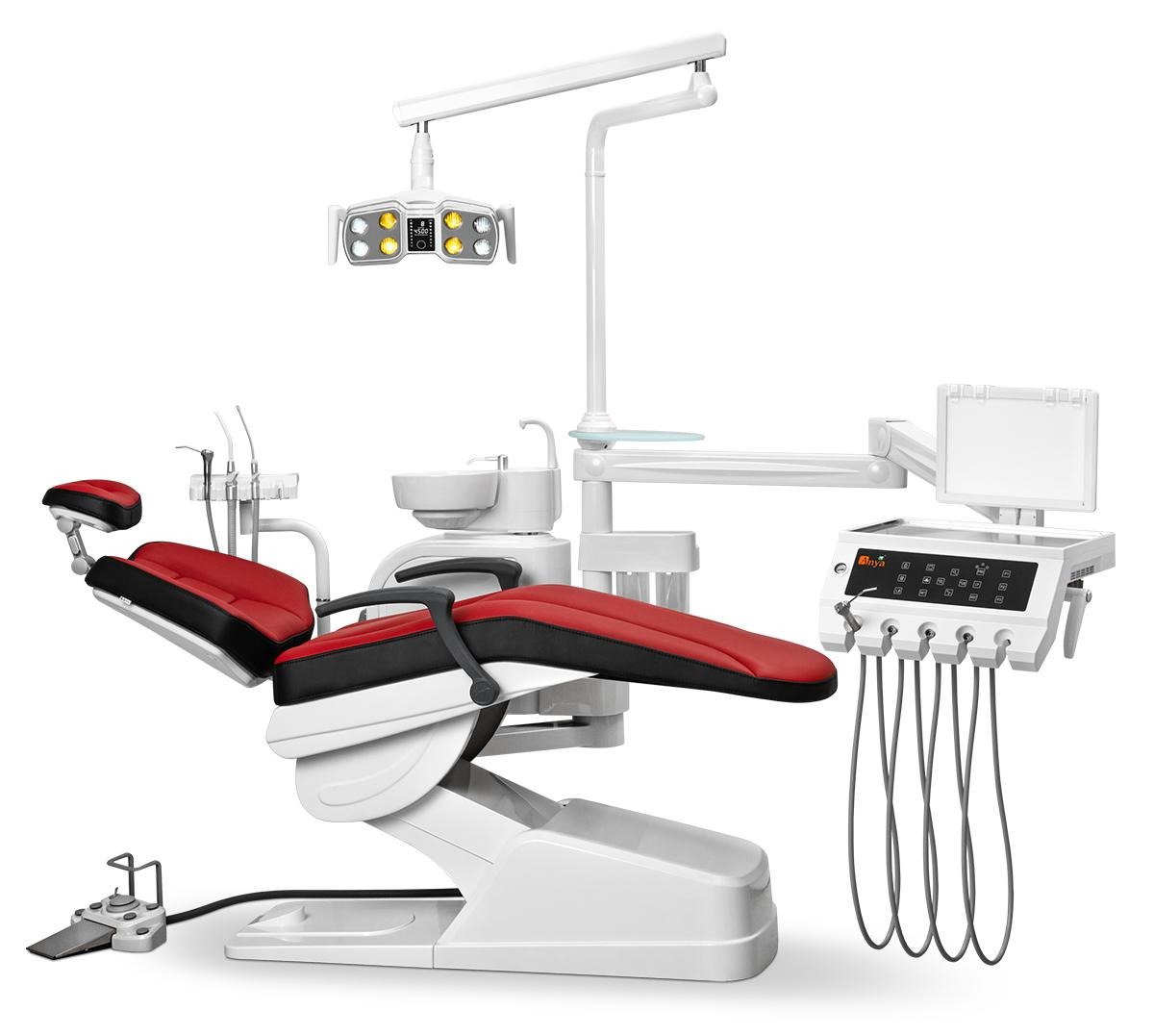 -Врачебный модуль имеет пантограф с пневмотормозом. -Сенсорный блок управления креслом и плевательницей. -Большой негатоскоп позволяет читать ортопантомограммы. -Четыре выхода М4 и водовоздушный спрей. Подача инструментов нижняя.