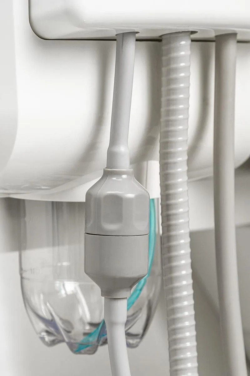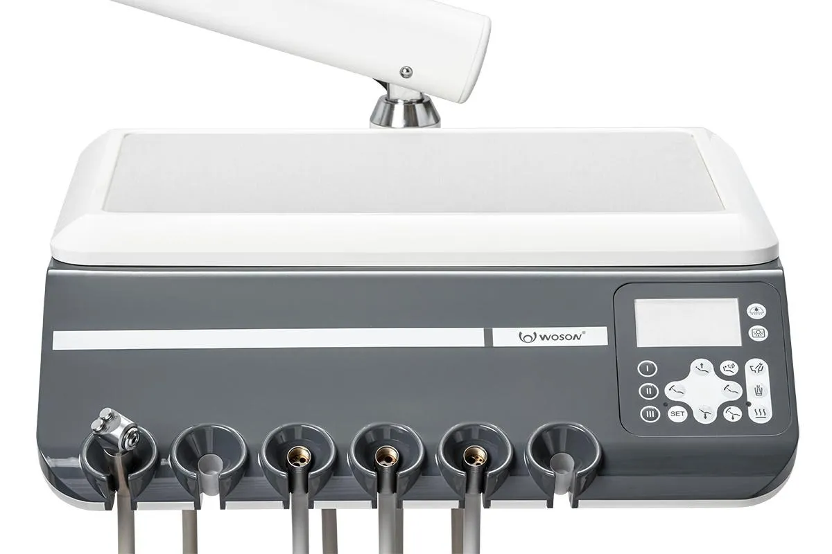Данная модель предполагает нижнюю подачу инструментов, очень популярную у стоматологов. Использование этого типа подачи позволяет увеличить скорость работы. Инструменты находятся на комфортном уровне, а соединительные шланги не мешают работать и не путаются под ногами. Блок рассчитан на 6 инструментов.